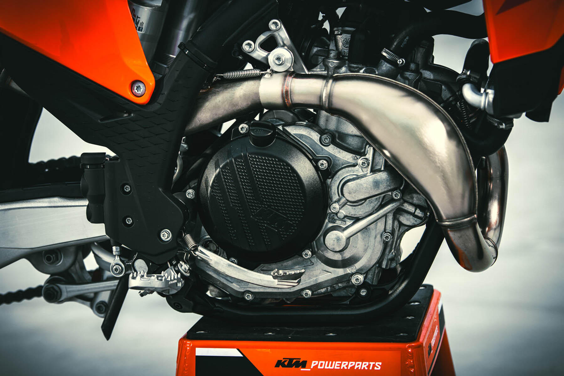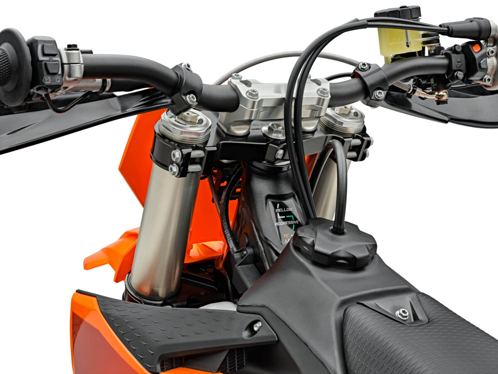 Eine der bedeutendsten Neuerungen ist die Einführung einer einstellbaren 48mm Closed-Cartridge-Gabel vom Typ WP XACT. Diese Gabel verwendet ein neues Kolbenkonzept, das den Ölfluss innerhalb der Kartusche optimiert und die Gefahr von Ölschäumung minimiert. Ein verbesserter Hydro-Stopp soll in Extremsituationen, wie bei großen Sprüngen, zusätzliche Sicherheit bieten. Der WP-XACT-Hinterradstoßdämpfer wurde ebenfalls angepasst, um eine präzisere Kontrolle zu ermöglichen.