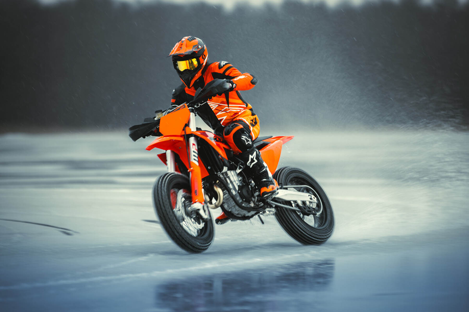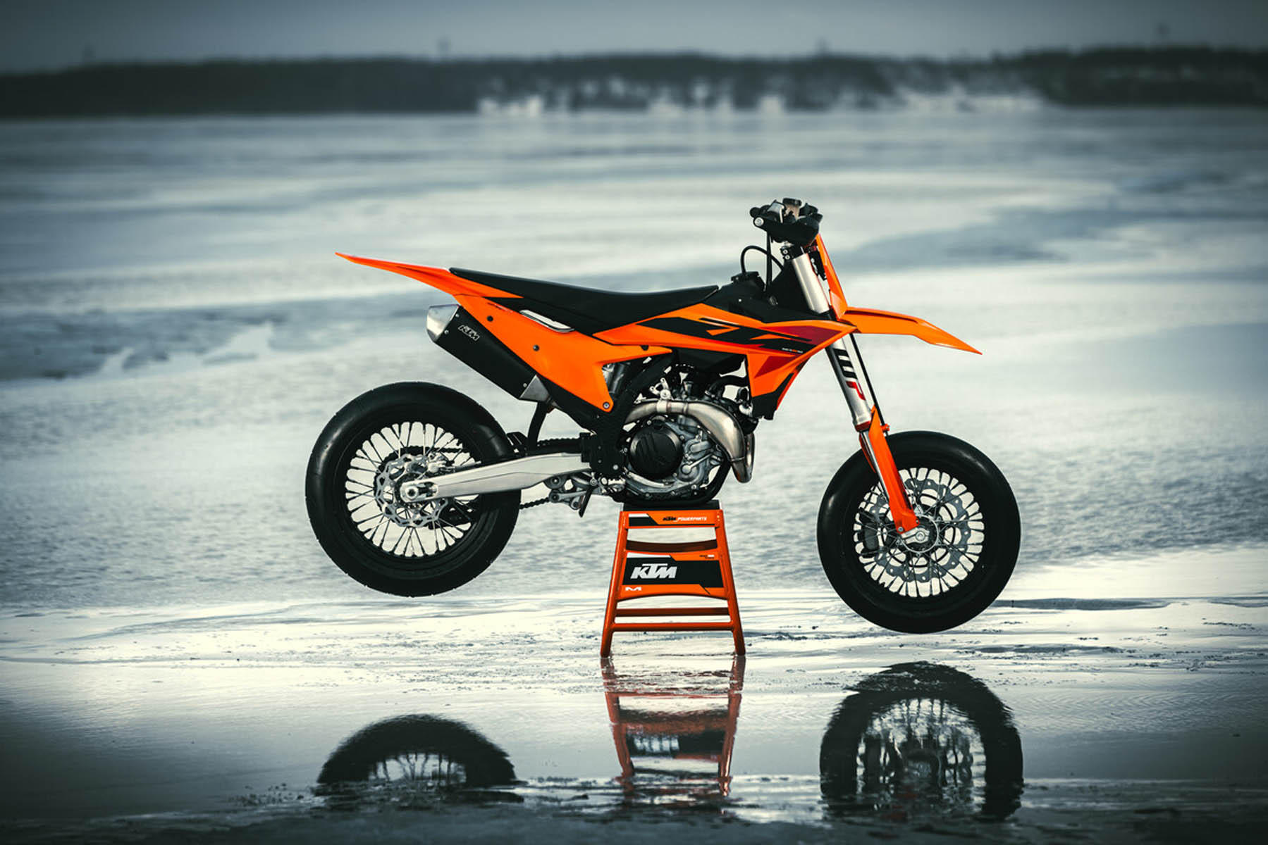 Die KTM 450 SMR 2025 wurde unter verschiedenen extremen Bedingungen getestet, um ihre Zuverlässigkeit und Leistung zu gewährleisten. Diese Tests wurden unter anderem auf spanischem Asphalt bei hohen Temperaturen sowie auf Eis in Schweden durchgeführt.